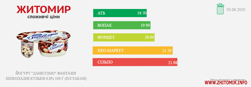 МОНІТОРИНГ ЗДІЙСНЕНО МЕТОДОМ КОНТРОЛЬНОЇ ЗАКУПІВЛІ, У МІСЦЯХ ПРОДАЖУ: AТБ, пр. Миру, 15 А, ЕКО-маркет, вул. Мала Бердичівська, 2/7, Сільпо, майдан Житній ринок, 1, Фуршет, вул. Вітрука, 9 а, Вопак, вул. Київська, 87