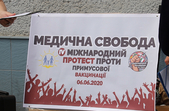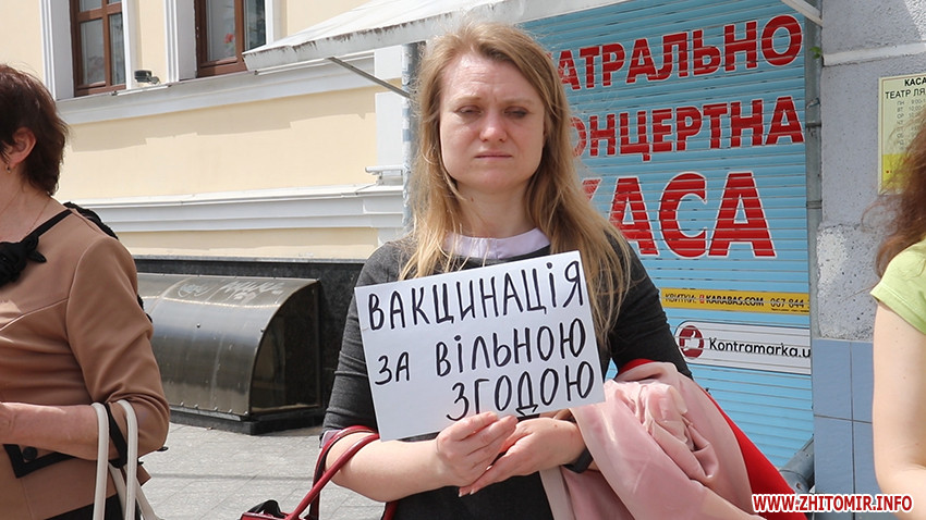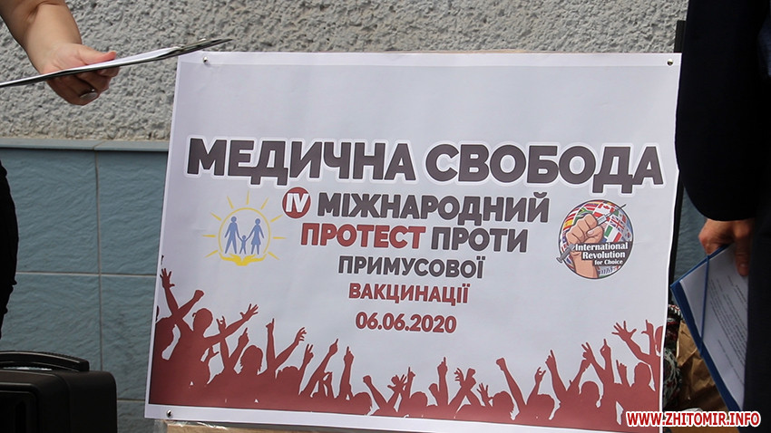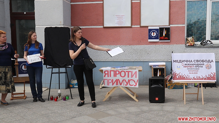 У Житомирі на Михайлівській 6 червня пройшла акція проти примусової вакцинації в рамках четвертого Міжнародного протесту. До неї приєдналося понад двадцять людей.