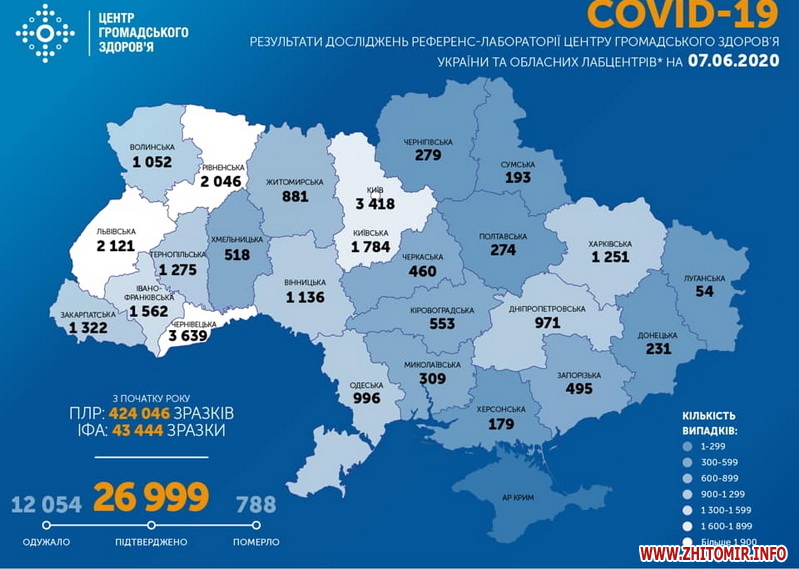 Як повідомляв Житомир.info, станом на 9.00 6 червня в Україні лабораторно підтверджено 26 тисяч 514 випадків COVID-19, з них 550 – виявлені упродовж останньої доби.