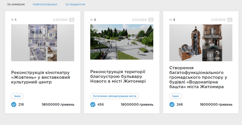 Як повідомляв Житомир.info, з 1 червня 2020 розпочалось голосування за кращий загальноміський проєкт: кінотеатр «Жовтень», Новий бульвар чи Водонапірну вежу.
