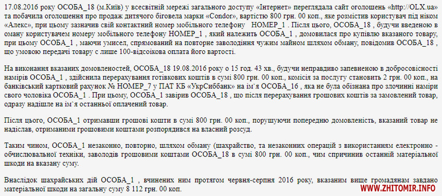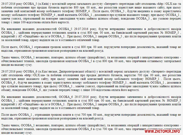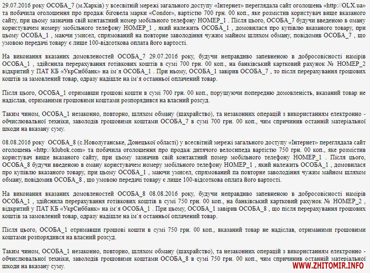 «У невстановлений слідством день та час, в період з червня по серпень 2016 року ОСОБА_1, маючи навички роботи із комп`ютерною технікою та інтернет-ресурсами, з використанням електронно-обчислювальної техніки персонального комп`ютера, знаходячись в м. Житомирі, використовуючи свій обліковий запис, зареєстрований на сайті Інтернет оголошень «http://kloomba.com», «https://ukrrover.jimdo.com », «http://klubok.com» та сайті Інтернет-оголошень «http://OLX.ua», з метою подальшого незаконного заволодіння коштами потенційних клієнтів шляхом обману, розмістив на вказаних сайтах оголошення на продаж різноманітних товарів, які насправді нe мав наміру продавати, в результаті чого вчинив ряд умисних, корисливих кримінальних правопорушень», – йдеться у матеріалах суду.