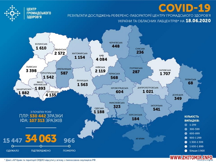 В Україні станом на ранок 18 червня підтверджено 34 063 випадки COVID-19, з них 15 447 одужали, 966 померли. Протягом останньої доби лабораторно підтверджено 829 випадків.