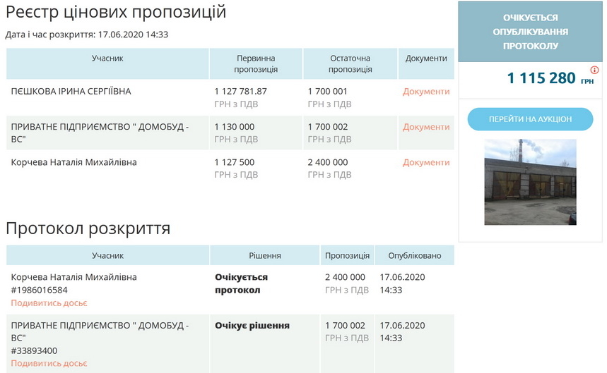 На торгах було троє учасників, переможцем стало ТОВ «Окфест», яке впродовж трьох раундів не підвищувало ціну й перемогло зі своєю початковою пропозицією 1 млн 226 тис. 009 грн (15 тис. 460 грн за 1 кв.м.), що на 411 тис. 439,4 грн більше, ніж початкова ціна.