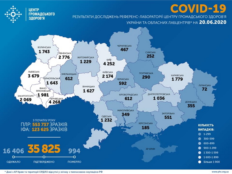 Станом на ранок 20 червня в Україні 35 825 лабораторно підтверджених випадків COVID-19, з них 994 летальні, 16 406 пацієнтів одужало. За останню добу зафіксовано 841 новий випадок.