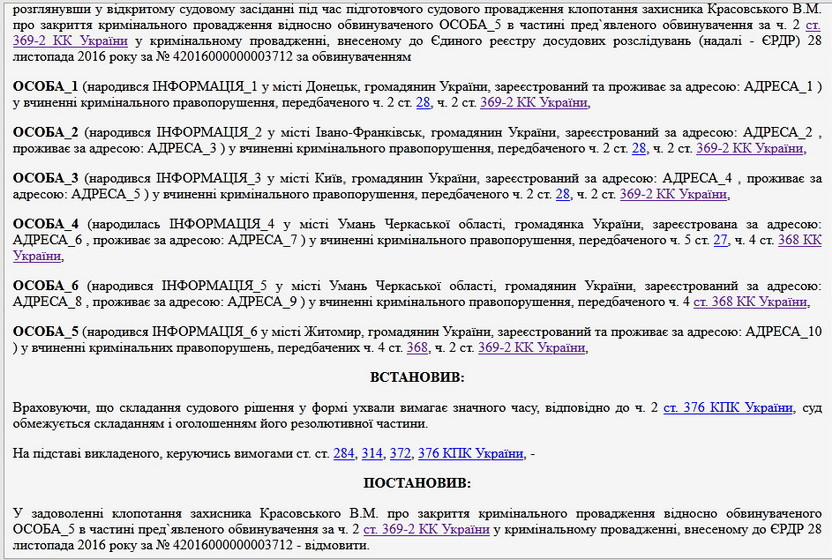 «У задоволенні клопотання захисника Красовського В.М. про закриття кримінального провадження відносно обвинуваченого ОСОБА_5 в частині пред`явленого обвинувачення за ч. 2 ст. 369-2 КК України у кримінальному провадженні, внесеному до ЄРДР 28 листопада 2016 року за № 42016000000003712 - відмовити. Ухвала оскарженню не підлягає і набирає законної сили з моменту її проголошення. Заперечення проти неї можуть бути включені до апеляційної скарги на судове рішення, передбачене ч. 1 ст. 392 КПК України», - йдеться в ухвалі.
