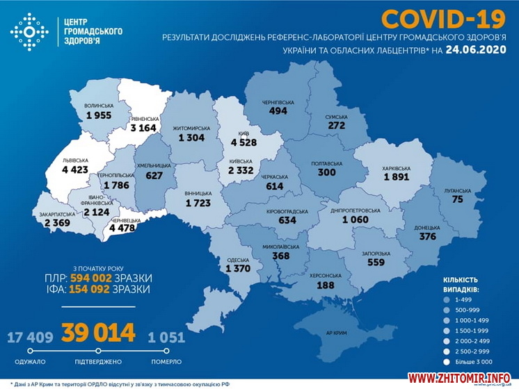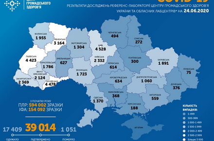 Станом на ранок 24 червня в Україні підтверджено 39 014 випадків COVID-19, з них 17 409 одужали, 1051 помер. Протягом останньої доби лабораторно підтверджено 940 випадків.
