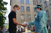 На вході до пункту тестування дають можливість обробити руки антисептиком, медики міряють температуру. Заходити всередину дозволяють лише за наявності маски або респіратора.