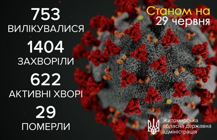 «Сумарна чисельність інфікувань становить 1404 особи.Найбільша кількість заражень спостерігається в Житомирі – 471 людина, в Житомирському районі – 175 та в Коростені – 128.Кількість хворих, що перебувають на самоізоляції та в медичних закладах – 622.Загальна кількість одужалих – 753 особи», - йдеться у повідомленні.