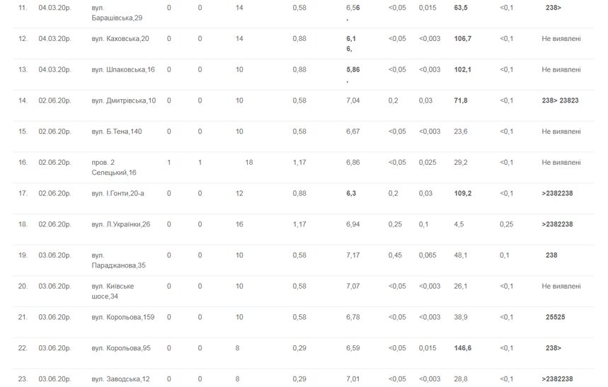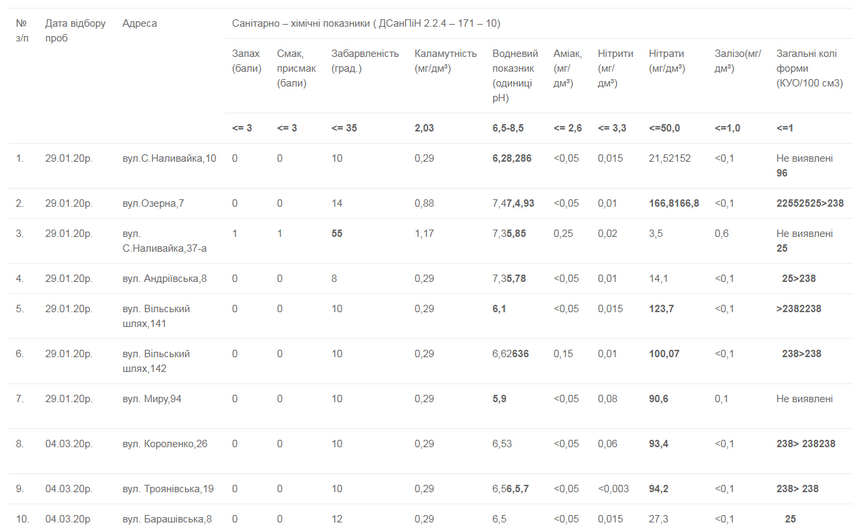 «Таким чином, відповідно до отриманих результатів, жителям міста Житомир не рекомендується вживати воду з громадських колодязів за наступними адресами: вул. С.Наливайка,10, вул. Озерна, 7, вул. С.Наливайка, 37-а, вул. Андріївська, 8, вул. Вільський шлях, 141, вул. Вільський шлях, 142, вул. Миру, 94, вул. Короленка, 26, вул. Троянівська, 19, вул. Барашівська, 8, вул. Барашівська, 29, вул. Каховська, 20, вул. Шпаковська, 16, вул. Дмитрівська, 10, вул. І.Гонти, 20-а, вул. Л.Українки, 26, вул. С.Параджанова, 35, вул. Корольова, 159, вул. Корольова, 95, вул. Заводська, 12», – йдеться у повідомленні.