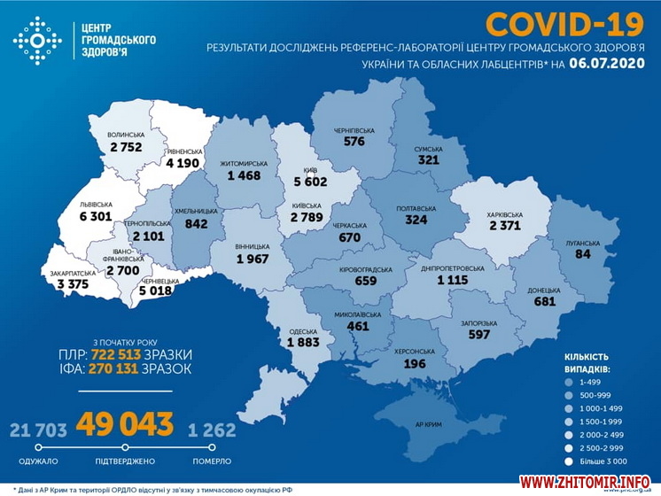 Станом на 09.30 год. 6 липня в Україні підтверджено 49 043 випадки COVID-19, з них 21 703 одужали, 1262 померли. Протягом останньої доби лабораторно підтверджено 543 випадки.