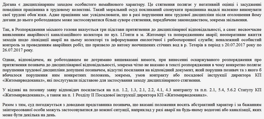 Нагадаємо, 7 червня 2017 року колективу водоканалу представили нового керівника – Андрія Нікітін, а за кілька місяців після призначення на посаду він вже отримав догану. Причиною притягнення до дисциплінарної відповідальності став витік стічних вод у річку Тетерів в райони вулиці Івана Гонти в липні 2017 року. Після отримання у вересні цього ж року висновку ветеринарної інспекції, що у загибелі риби в Тетереві вини водоканалу немає, Андрій Нікітін звернувся до суду з позовом до мера Сергія Сухомлина та міської ради, вимагаючи скасувати розпорядження про догану.
