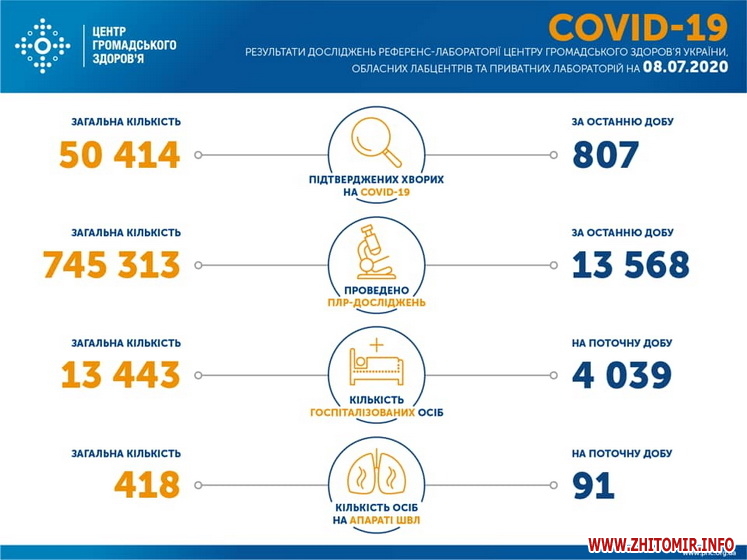 Як повідомляв Житомир.info, станом на ранок 7 липня 2020 року в Україні було підтверджено 49 тисяч 607 випадків COVID-19. Протягом попередньої доби лабораторно підтверджено 564 випадки хвороби.