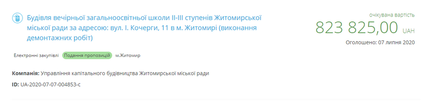 Нагадаємо, попередній тендер на демонтаж будівлі вечірньої школи в центрі Житомира управління капітального будівництва оголосило у лютому 2020. На участь в аукціоні надійшло 5 пропозицій, але усі відхилили: у двох з них (з нижчою ціновою пропозицією) виявили недоліки у формуванні кошторисів, а троє інших учасників не змогли надати підтвердження наявного досвіду у виконанні аналогічних демонтажних робіт. Тож у квітні тендер визнали таким, що не відбувся.