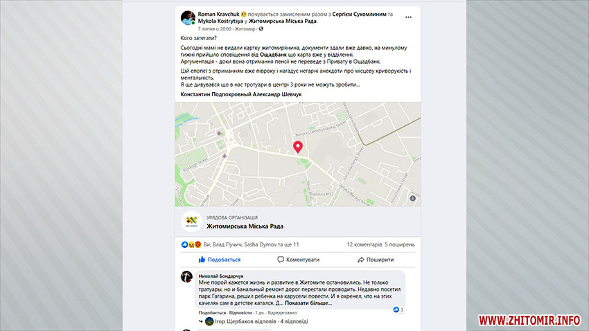У соціальних мережах містяни скаржаться, що не можуть отримати «Картку житомирянина». У своїх дописах люди пояснюють, що банк відмовляється надати картку особам, які не є його клієнтами.