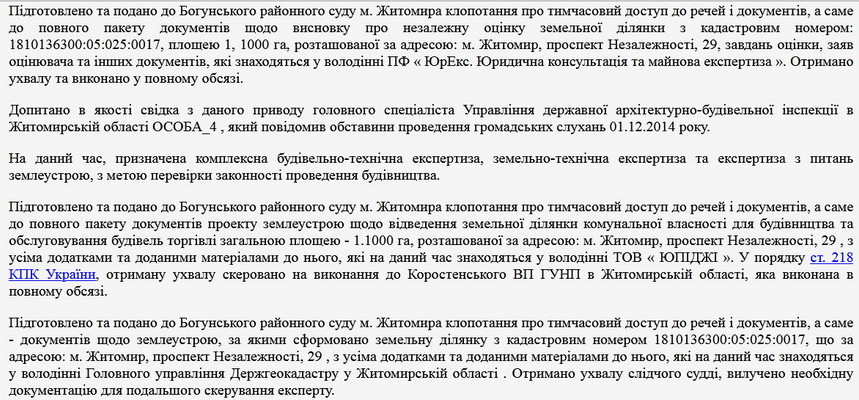 «В ході досудового розслідування встановлено, що Житомирською міською радою прийнято рішення № 765 від 26.09.2014 року «Про надання дозволів на розроблення проектів землеустрою щодо відведення земельних ділянок юридичним особам державної та комунальної власності». Департаментом містобудування та земельних відносин Житомирської міської ради видано Висновок № 13/2015 для розгляду та погодження проекту землеустрою щодо відведення земельної ділянки для будівництва та обслуговування будівель торгівлі за адресою: м. Житомир, проспект Незалежності, 29. У подальшому, Житомирською міською радою було прийнято рішення № 175 від 16.03.2016 року «Про затвердження проекту землеустрою щодо відведення земельної ділянки за адресою: м. Житомир, проспект незалежності, 29, з метою реалізації на земельному аукціоні», рішення № 398 від 13.10.2016 року «Про затвердження переліку земельних ділянок в м. Житомирі призначених для продажу на земельних торгах у формі аукціону». Житомирською міською радою було прийнято рішення № 1175 від 21.12.2016 року «Про проведення земельних торгів у формі аукціону в м.Житомирі». Переможцем даних торгів стало Товариство з обмеженою відповідальністю «ЮПІДЖІ» (код 38862560). Однак, у подальшому, Департаментом містобудування та земельних відносин Житомирської міської ради видано містобудівні умови та обмеження від 08.08.2017 року за № 52/17 на нове будівництво АЗК з пунктом сервісного обслуговування населення, адміністративними приміщеннями, АГЗП та автомийки за адресою: м. Житомир, проспект Незалежності, 29. Отже, земельна ділянка виділялася та продавалася з аукціону не під будівництво АЗС, а під вже готовий проект щодо можливості будівництва та обслуговування будівель торгівлі в межах земельної ділянки, про що й свідчить рішення Житомирської міської ради № 48 від 28.12.2015 року з додатками», - йдеться в матеріалах суду.