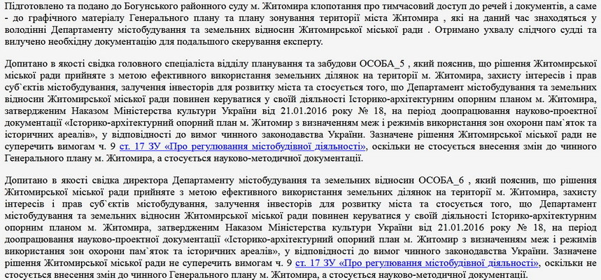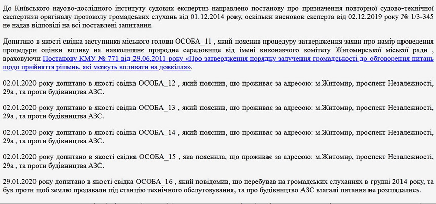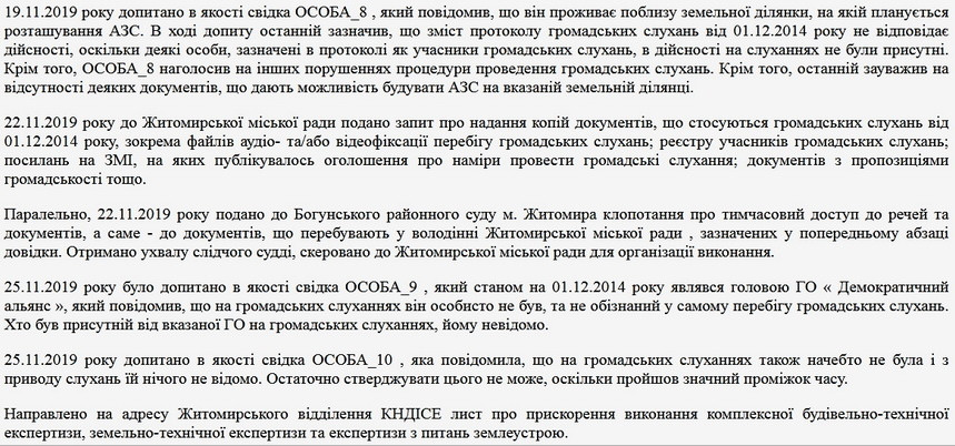«Допитано в якості свідка депутата Житомирської міської ради ОСОБА_7, який повідомив, що на громадських слуханнях він не був, а цитата із протоколу громадських слухань є дійсно його, проте, як пояснив останній, вказаний текст він проговорював при інших обставинах (при яких саме - не пам`ятає), а станом на дату, зазначену у протоколі громадських слухань, як повідомив ОСОБА_7, він був біля прокуратури Житомирської області на мітингу. Також останній повідомив, що дійсно, на оглянутому відеозаписі (див. попередній абзац) дійсно його голос, проте коли і при яких обставинах він все це проговорював, ОСОБА_7 не пам`ятає, але точно не на громадських слуханнях з приводу будівництва АЗС по проспекту Незалежності, 29 в м. Житомирі», - йдеться в ухвалі.