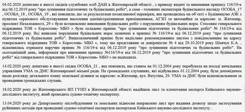 «Слідчий звернулася до суду з клопотанням про продовження строку досудового розслідування, в якому вказала, що до Житомирського ВП ГУНП в Житомирській області надійшла заява депутата Житомирської обласної ради ОСОБА_1 з приводу того, що за адресою: м. Житомир, проспект Незалежності, 29 , будується автозаправна станція з порушенням будівельних норм та правил безпеки. За даним фактом внесено відомості до Єдиного реєстру досудових розслідувань за №12019060020002431, за ознаками кримінального правопорушення, передбаченого ч. 1 ст. 358 КК України», - зазначається в ухвалі.