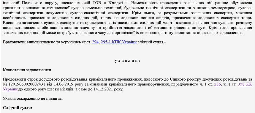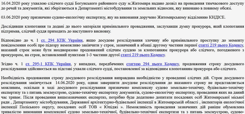 «Строк досудового розслідування закінчується 14.06.2020 року, однак завершити досудове розслідування до вказаного строку не представляється можливим, оскільки в ході досудового розслідування призначено комплексну судово земельно-технічну, будівельно-технічну експертизу та з питань землеустрою, судово-технічну експертизу документів, судово-екологічну експертизу, проведення яких на даний час триває. Після проведення вищезазначених експертиз, потрібно буде додатково допитати посадових осіб Житомирської міської ради, Департаменту містобудування, Державної архітектурно-будівельної інспекції в Житомирській області, інспекторів екологічної інспекції Поліського округу, посадових осіб ТОВ «Юпіджі». Неможливість проведення зазначених дій раніше обумовлена тривалістю виконання комплексної судово земельно-технічної, будівельно-технічної експертизи та з питань землеустрою, судово-технічної експертизи документів, судово-екологічної експертизи. Крім цього, за результатами зазначених експертиз, можлива необхідність проведення додаткових слідчих дій, таких як: додаткові допити свідків, призначення додаткових експертиз тощо. Висновки зазначених судових експертиз та проведення за їх наслідками слідчих дій мають важливе значення для судового розгляду щодо встановлення обставин вчинення злочину та прийняття законного і об`єктивного рішення по суті. Крім того, проведення зазначених слідчих дій може потребувати значного часу для організації їх виконання, а тому клопотання підлягає до задоволення», - йдеться в ухвалі.