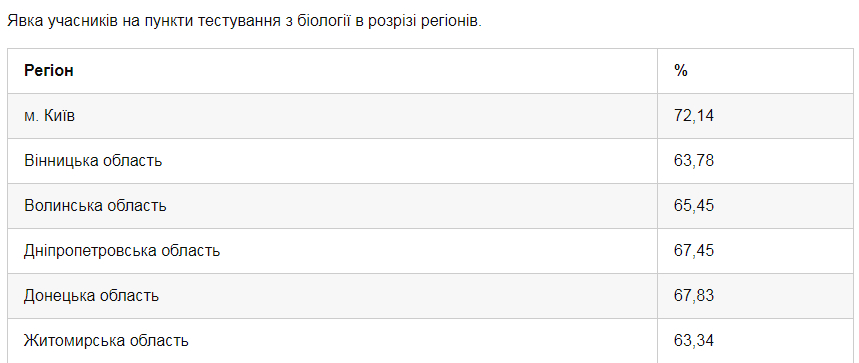 Український центр оцінювання якості освіти повідомляє, що загалом по Україні явка на тестування з біології склала 65,38%.