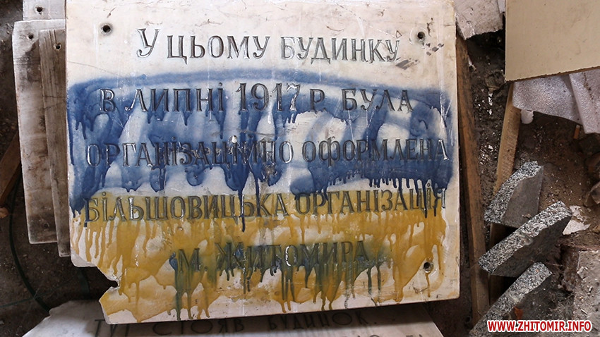 У 2016 році в Житомирі демонтували 19 дощок і пам'ятних знаків, які підпадають під закон про декомунізацію. Вже кілька років вони зберігаються на комунальному підприємстві «Зеленбуд».