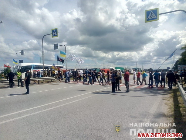 У пресслужбі патрульної поліції Житомирської області Житомир.info уточнили, що перекрили трасу учасники АТО з приводу виділення земельних ділянок.
