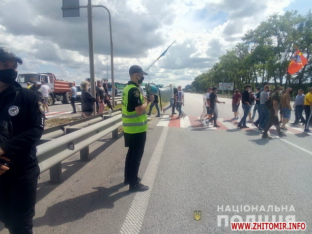 «У Житомирському районі наразі частково обмежено рух транспорту через акцію громадян. На місці працюють поліцейські, які організовують об’їзд для транспортних засобів. Зранку 15 липня на 128 км автодороги Київ – Чоп, поблизу с. Гадзинки Житомирського району, учасники акції частково обмежили рух транспорту. Люди рухаються по пішохідному переходу, пропускаючи автомобілі екстрених служб», - йдеться у повідомленні.
