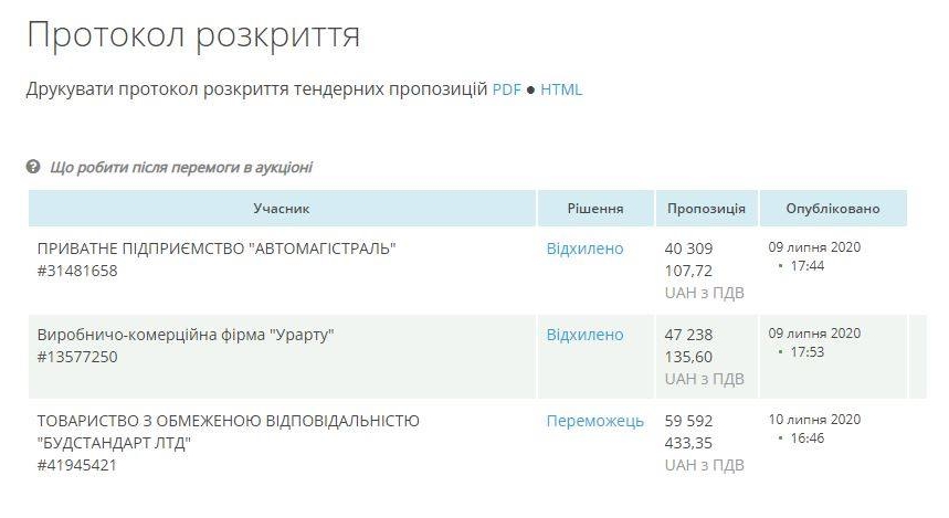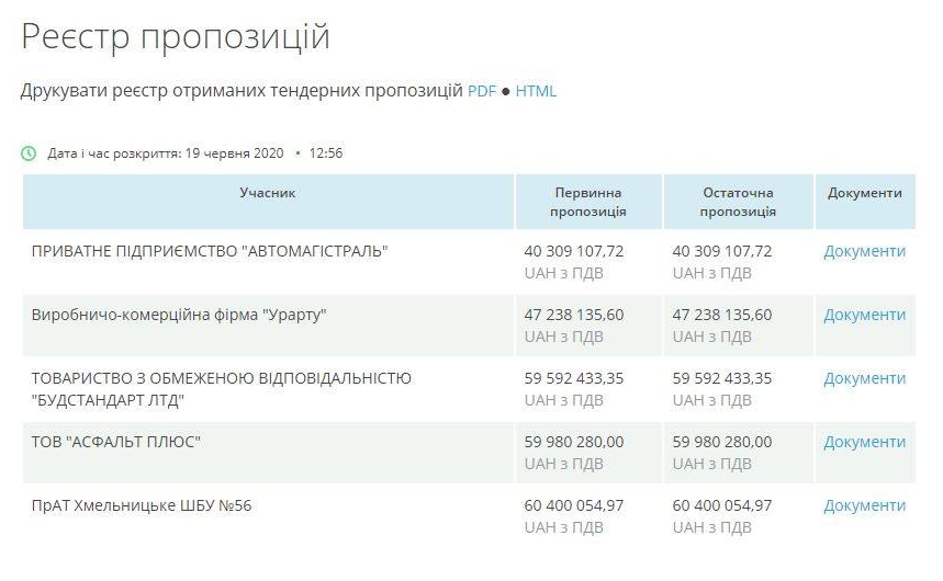 Участь у торгах взяли п’ять фірм: ПП “Автомагістраль” з пропозицією у 40 млн 309 тис. 107 грн 72 коп., виробничо-комерційна фірма “Урарту” з пропозицію у 47 млн 238 тис. 135 грн 60 коп., ТОВ “Будстандарт ЛТД” з пропозицію у 59 млн 592 тис. 433 грн 35 коп., ТОВ “Асфальт Плюс” з пропозицією у 59 млн 980 тис. 280 грн та ПрАТ “Хмельницьке ШБУ №56” з пропозицією у 60 млн 400 тис. 54 грн 97 коп.