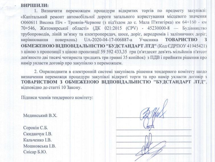 10 липня департамент регіонального розвитку Житомирської ОДА опублікував намір підписати договір з ТОВ “Будстандарт ЛТД”.