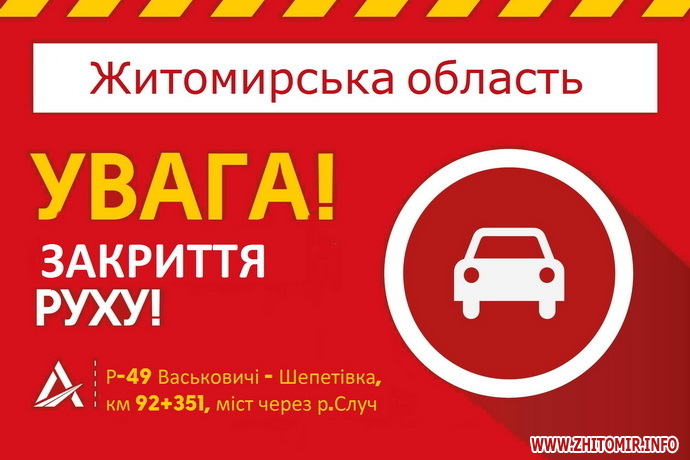 «У зв’язку з розпочатими роботами з капітального ремонту мосту через річку Случ на шляху Р-49 Васьковичі – Шепетівка, км 92+351, що у селі Чижівка Новоград-Волинського району, рух штучною спорудою від 20 липня та до кінця року буде закрито», - йдеться у повідомленні.