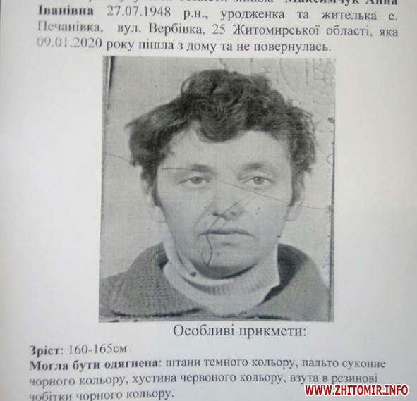 Досі перебуває у розшуку пенсіонерка Анна Максимчук, жителька села Печанівка Романівського району, яка 9 січня 2020 року пішла з дому і не повернулася.
