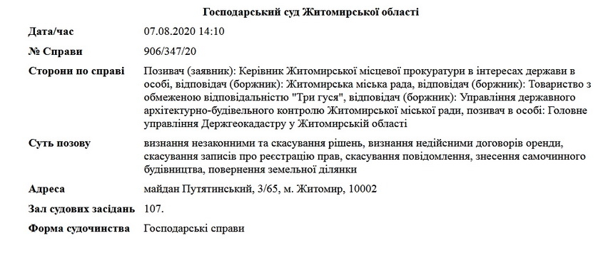 В квітні 2020 року Житомирська місцева прокуратура в інтересах держави звернулася до суду з позовом до Житомирської міської ради, ТОВ «Три гуся» та міського управління ДАБК щодо земельної ділянки по вулиці Лятошинського, яку вимагає повернути громаді міста, а «Три гуся» мають «знести самочинне будівництво – об`єкт незавершеного будівництва готельно-ресторанного комплексу, що знаходиться по вулиці Лятошинського, 3 в м. Житомирі».