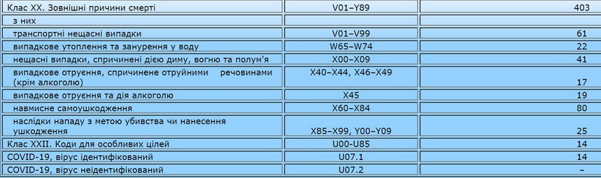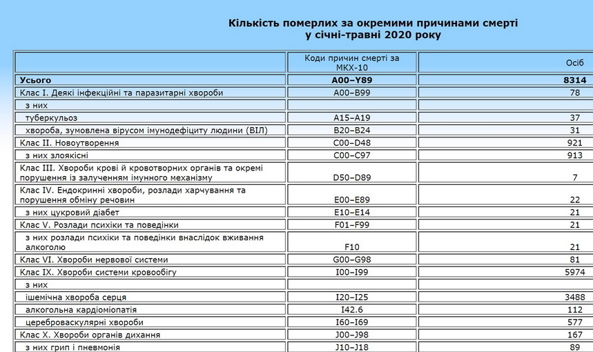 Такі дані наведені у таблиці головного управління статистики у Житомирській області «Кількість померлих за окремими причинами смерті у січні-травні 2020 року», опублікованій 23 липня.
