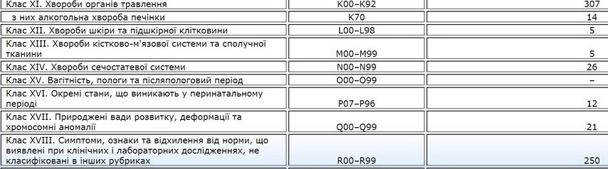 Через хвороби органів травлення в засвіти відійшли 307 людей, від хвороб органів дихання – 167, у тому числі 89 – від грипу і пневмонії. Від хвороб нервової системи померла 81 особа, від деяких інфекційних та паразитарних хвороб – 78, з них від туберкульозу – 37, xвороб, зумовлених вірусом імунодефіциту людини – 31.