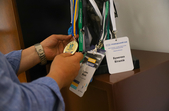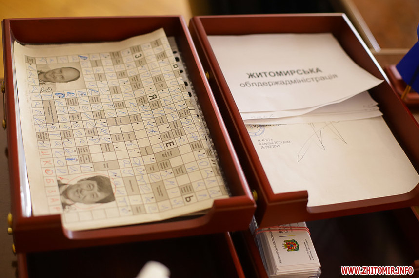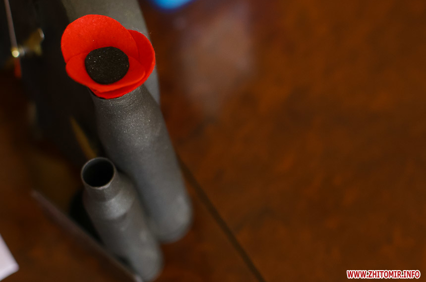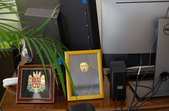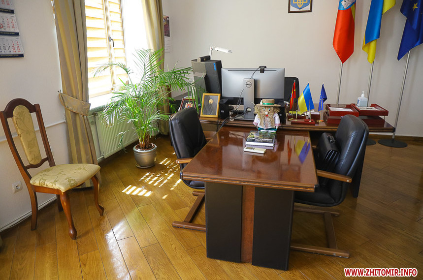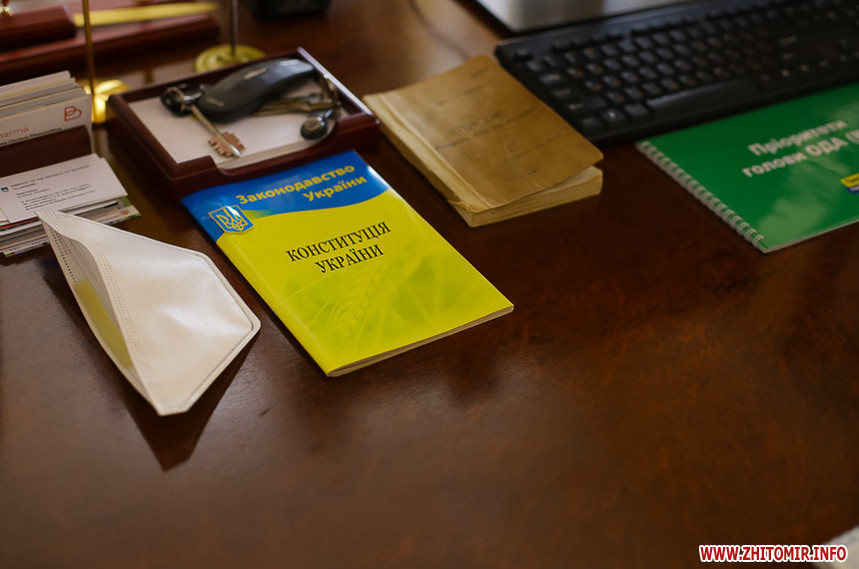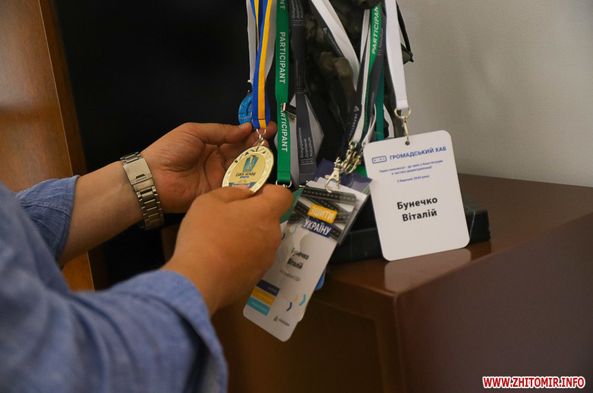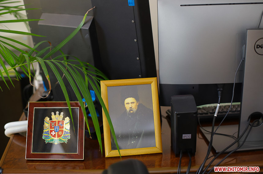 Ось це - мої шеврони, які я зняв з військової форми і які нагадують мені, хто я і що я. Офіційний знак Житомирщини, мені подарували на презентації», - розповідає Бунечко, демонструючи свій робочий стіл.