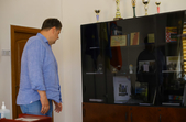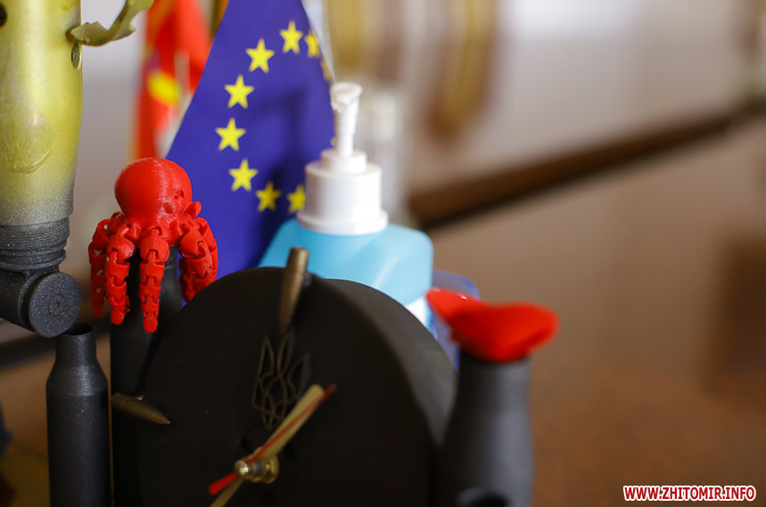 Все інше тут - подарунки моїх друзів. Лампа з відстріляних снарядів, годинник з відстріляної міни, підставка для олівців з «лимонки», мак, який я привіз з Маріуполя, у якому я був на 9 травня. Восьминіг - зроблений на 3-D принтері у житомирському «Політесі». Це я у дітей попросив, коли був там. А це мені кардинал, коли ми були у неділю у монастирі Кармелітів, презентував. Магнітик «Чикаго» - подарунок народних депутатів. Коли я їм телефонував, то я був у Чуднові, а один з них - у Чикаго. Якось так.
