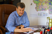Ось це - карта, яку я повісив. Там прикріплені питання, які потрібно доповідати постійно президентові. Ось це - виділені населені пункти, які я вже відвідав за час своєї каденції. От ви підете - і я хочу поїхати у Нову Борову та Іршанськ.