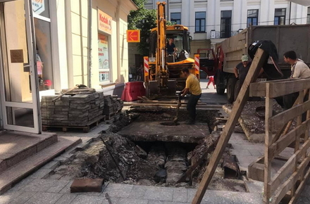 Ремонтні роботи розпочали від пішохідної вулиці Михайлівської, де, аби дістатися до підземних комунікацій, вже зняли частину нової плитки.