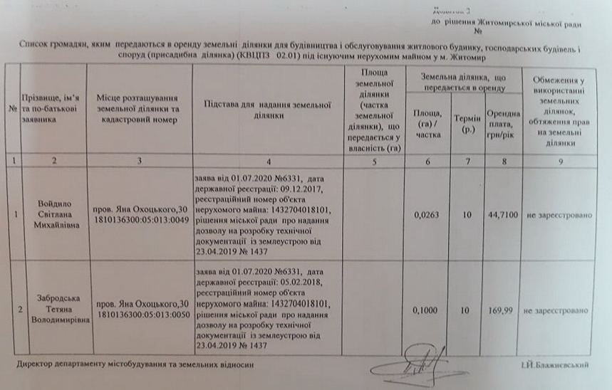 Перед розглядом питання «Про погодження технічної документації із землеустрою щодо поділу земельних ділянок у м.Житомирі» про конфлікт інтересів заявив голова фракції ВО «Батьківщина» Геннадій Забродський, пояснивши, що один з пунктів стосується його дружини та тещі. Мова йде про орендовану ділянку на вул. Яна Охоцького,30 та окремий додаток до проєкту рішення – список громадян, яким передаються в оренду земельні ділянки для будівництва і обслуговування житлового будинку.