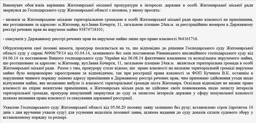 Зазначимо, Господарський суд Житомирської області ухвалою від 22 червня 2020 року відкрив провадження у справі за позовом місцевої прокуратури в інтересах держави в особі Житомирської міської ради, в якому прокурор просить: визнати за Житомирською міською територіальною громадою в особі Житомирської міської ради право власності на приміщення, яке розташоване за адресою: м.Житомир, вул.Івана Кочерги, 11, загальною площею 24 кв.м. за реєстраційним номером в Державному реєстрі речових прав на нерухоме майно 93874718101; скасувати у Державному реєстрі речових прав на нерухоме майно запис про право власності №4161716.