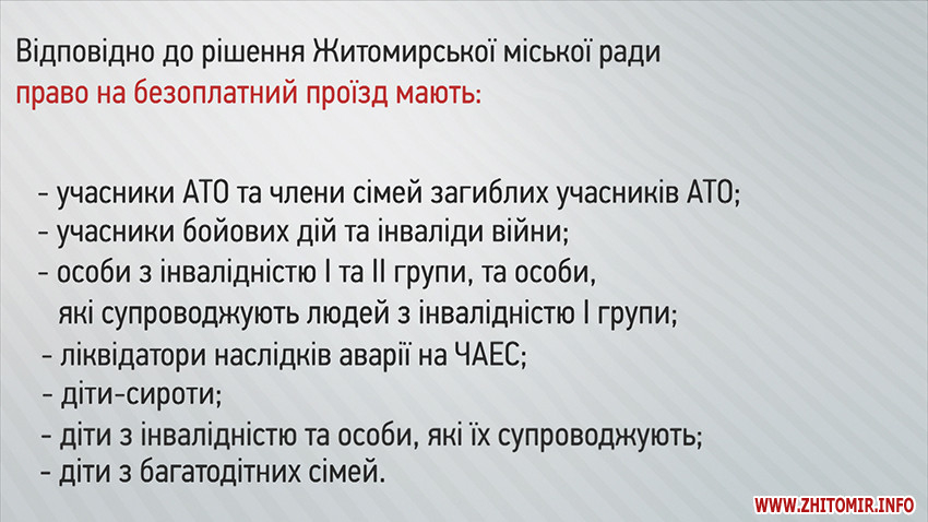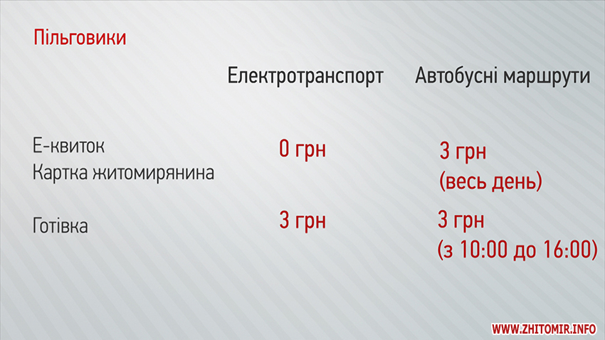 «Вартість проїзду по електронному квитку не змінюється взагалі, вартість проїзду по транспортній карточці, по проїзному квиткам теж не змінюється. «Карта житомирянина» на сьогоднішній день працює як пільгова картка для пенсіонерів та інвалідів ІІІ групи, що дає можливість їздити в електротранспорті безоплатно, а в маршрутному таксі, автобусі за пільговою вартістю, усе це лишається без змін. Проїзд для учнів також не зазнав змін. Фактично, відрізнятися буде тільки тариф при оплаті банківською карткою та при оплаті готівкою – зростає на 1 грн. Тобто різниця між вартістю проїзду по транспортній картці і готівкою становитиме дві гривні. Тому, будь ласка, з завтрашнього дня вводиться в дію усе те про, що ми повідомляли ще два місяці тому», - розповів Олександр Шевчук.
