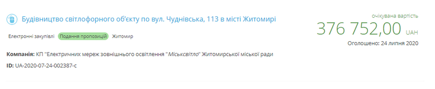 На ресурсі ProZorro наразі є інформація про оголошений 24 липня КП «ЕМЗО «Міськсвітло» тендер на будівництво світлофорного об’єкта по вул. Чуднівській, 113. Очікувана вартість закупівлі становить 376,7 тис. грн. Світлофор мають побудувати до кінця поточного року. Сам аукціон заплановано на 4 серпня.