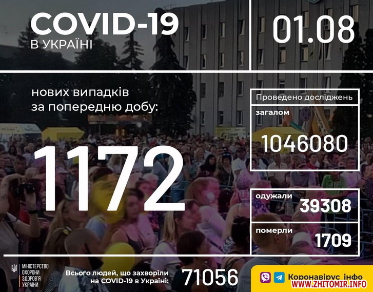 Станом на ранок 1 серпня в Україні коронавірус підтвердили в понад 71 тисячі людей, за добу – 1172 нові випадки. Одужали вже 39,3 тисячі пацієнтів, померли 1709 людей. У Житомирській області зафіксували 46 нових випадків.