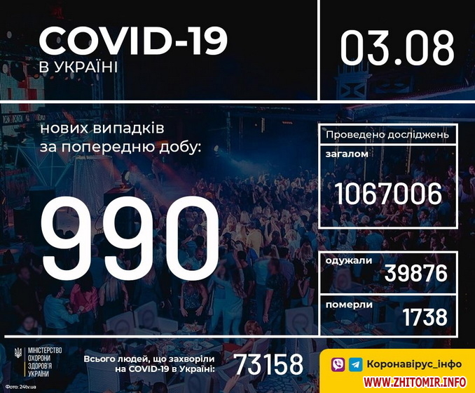 «03 серпня (станом на 9:00) в Україні 73 158 лабораторно підтверджених випадків COVID-19, з них 1738 летальних, 39 876 пацієнтів одужало. За добу зафіксовано 990 нових випадків. Загалом проведено 1 067 006 тестувань методом ПЛР. Усього за добу одужало 333 пацієнти», - йдеться у повідомленні.