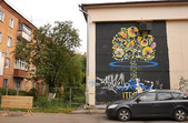 Минулого тижня художниця презентувала новий мурал у дворику кінотеатру ім. І. Франка на Михайлівській. Малювала безкоштовно, а з фарбою допомогли благодійники. На створення муралу пішло три тижні, 10 літрів фарби та 40 аерозольних балонів.