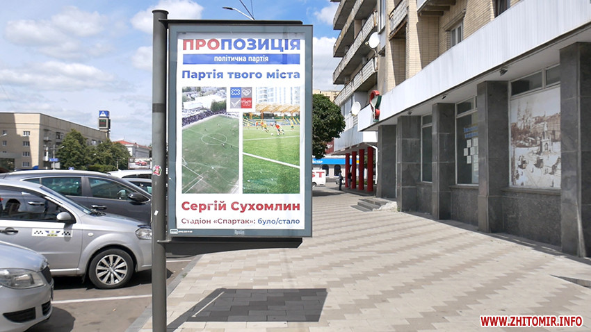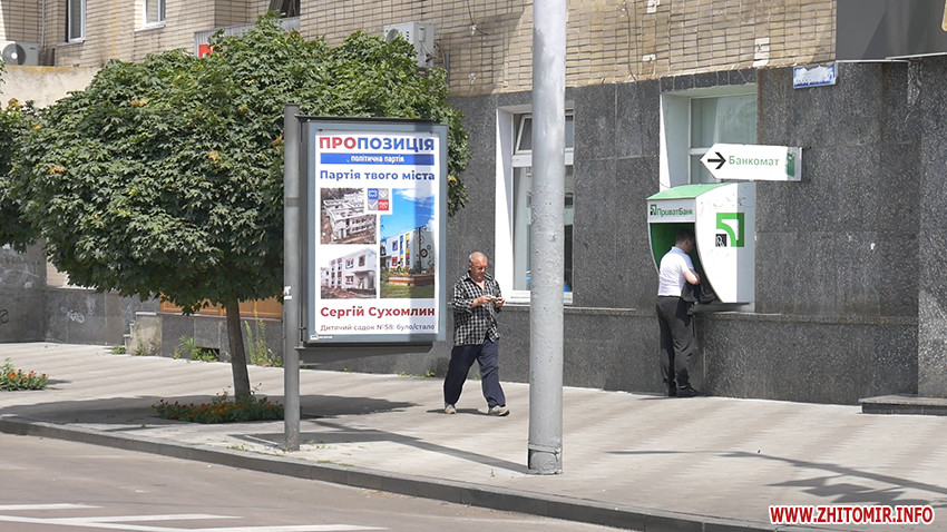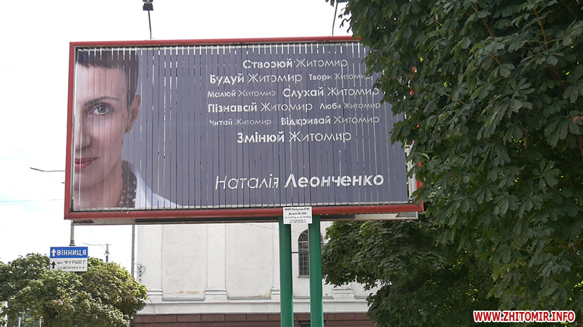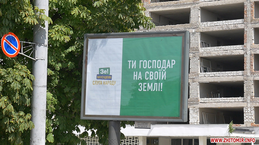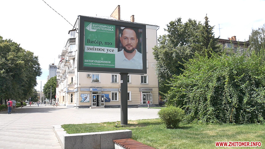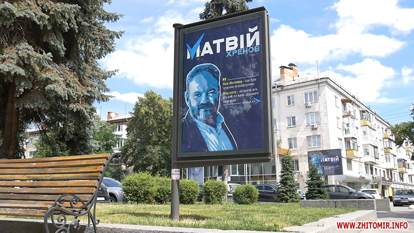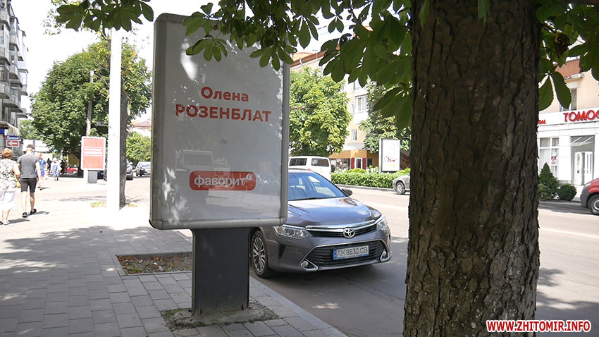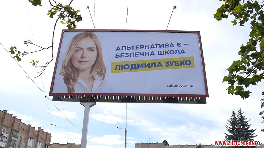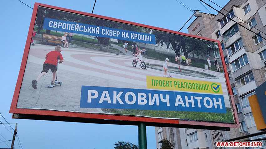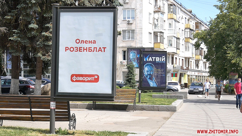На рекламних майданчиках можна побачити плакати нинішнього мера Сергія Сухомлина, де він порівнює різні об’єкти міської інфраструктури. Депутат міської ради Наталія Леонченко закликає з білбордів любити Житомир, дарувати квіти дружинам та гуляти із дітьми в парку після роботи. Сестра народного депутата України VIII скликання Борислава Розенблата Олена Розенблат скромно дописала біля свого прізвища назву сімейної компанії - «Фаворит». Людмила Зубко, дружина колишнього віцепрем’єр-міністра Геннадія Зубка, з плакатів впевнено заявляє: альтернативою тому, що відбувається навколо нас, є безпечна школа. Колишній заступник мера Житомира Матвій Хренов з рекламних бордів розповідає, що його мета – «об’єднати всіх, хто хоче тут жити і розвивати наше місто». Ректор Житомирської політехніки Віктор Євдокимов говорить нам про «вибір, що змінює все». Депутат міської ради Антон Ракович записує до здобутків незавершений проєкт бюджету участі – «Європейський сквер на Крошні».
