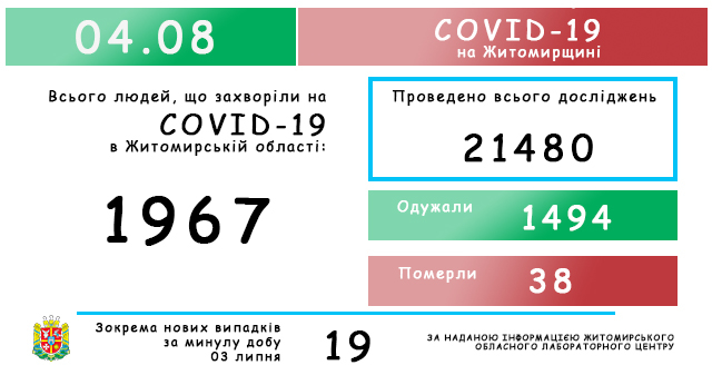 Нагадаємо, станом на 3 серпня в Житомирській області було виявлено 1948 випадків COVID-19, з них нові – 27. Одужали 1485 людей, померли – 38 пацієнтів.