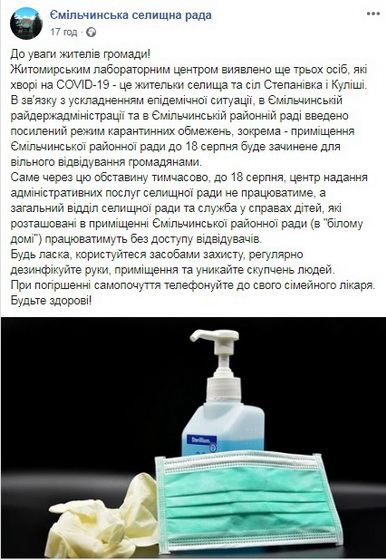 «До уваги жителів громади! Житомирським лабораторним центром виявлено ще трьох осіб, які хворі на COVID-19 - це жительки селища та сіл Степанівка і Куліші. В зв'язку з ускладненням епідемічної ситуації, в Ємільчинській райдержадміністрації та в Ємільчинській районній раді введено посилений режим карантинних обмежень, зокрема - приміщення Ємільчинської районної ради до 18 серпня буде зачинене для вільного відвідування громадянами. Саме через цю обставину тимчасово, до 18 серпня, центр надання адміністративних послуг селищної ради не працюватиме, а загальний відділ селищної ради та служба у справах дітей, які розташовані в приміщенні Ємільчинської районної ради (в "білому домі") працюватимуть без доступу відвідувачів», – йдеться у дописі.