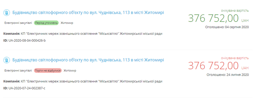 За даними ресурсу ProZorro, вдруге закупівлю оголосили 4 серпня. Умови тендеру та очікувана вартість закупівлі (376 тис. 752 грн) не змінилися.