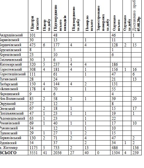 «За даними Житомирського обласного лабораторного центру станом на 09:00 06.08.2020 (за минулу добу – 5 серпня) зареєстровано 27 нових лабораторно підтверджених випадків», - йдеться у повідомленні.