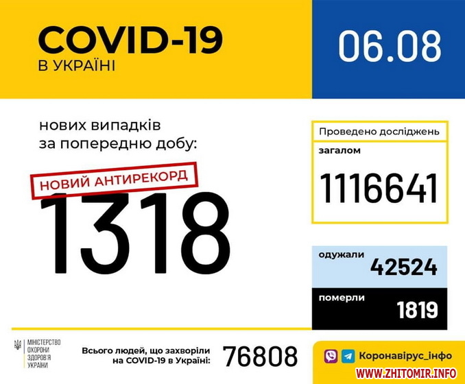 Як повідомляв Житомир.info, 5 серпня в Україні налічувалось 75 490 випадків COVID-19, з них 1271 – виявили упродовж доби.